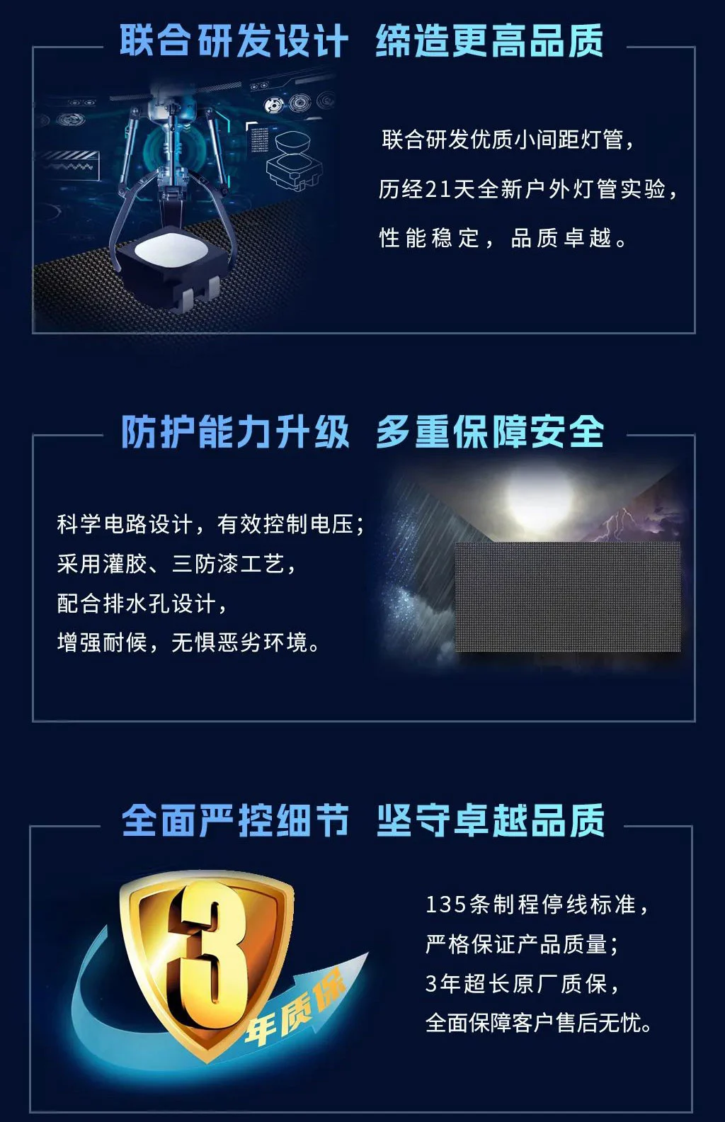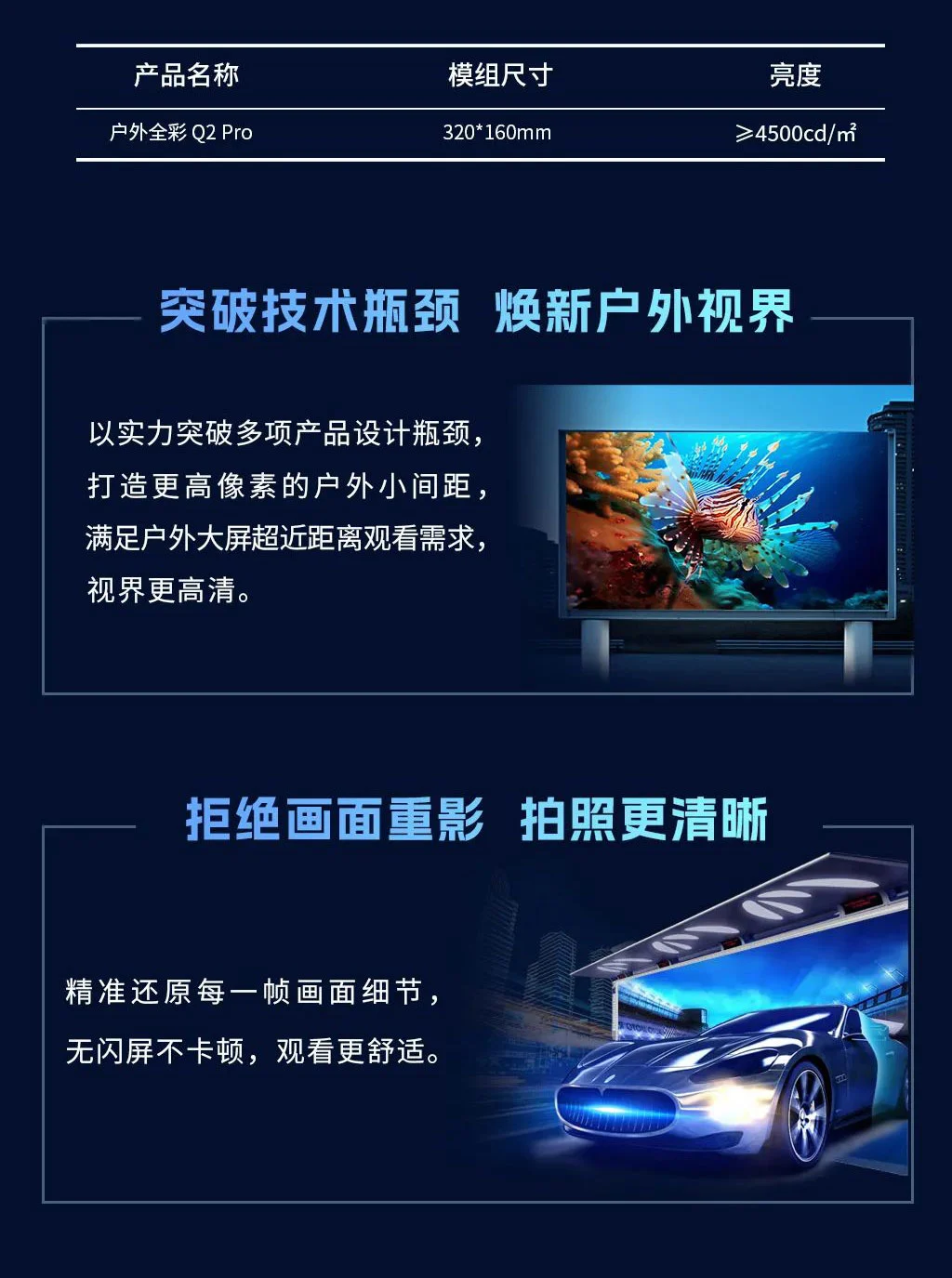 室外全彩Q2-40S-Pro单元板,效果更加清晰细腻、分辨率可达到1080P以上;实现高刷新率、高灰阶及较高灯管利用率;无残影、防“毛毛虫” 、低功耗、低突波等功能;
