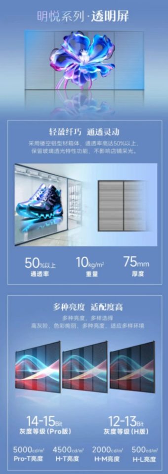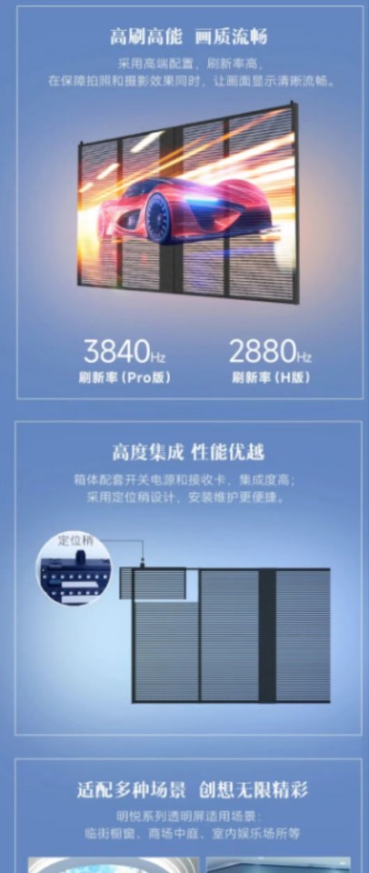 通透率高达50%以上;箱体厚度仅75mm,重量较常规屏减轻50%,轻盈易安装。